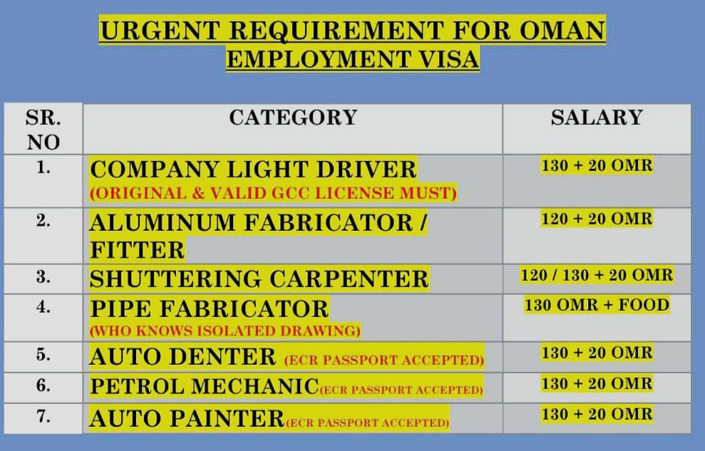 Urgently required for Oman – Employment Visa – Driver – Fitter – Carpenter – Denter – Painter