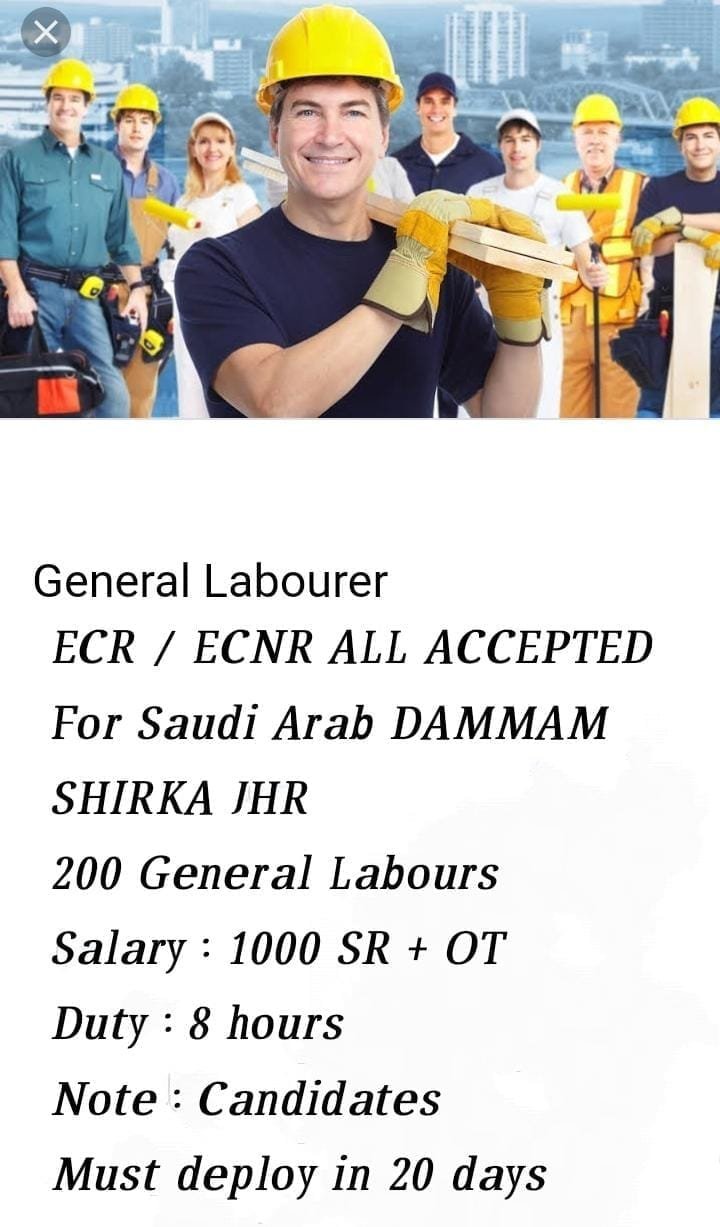 Required General labourer for Dammam shirka JHR Saudi
