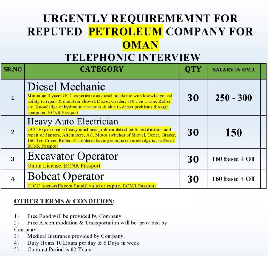 Diesel Mechanic – Auto Electrician – Excavator operators – Bobcat operator for Oman