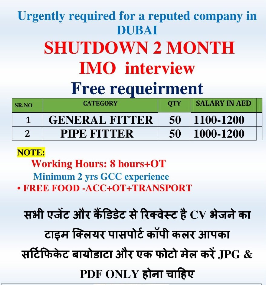 Required General Fitter – Pipe Fitter – Shutdown project – Dubai