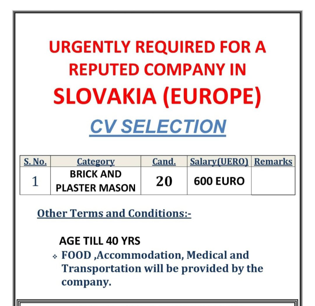 Required for Europe – Slovakia – Brick and Plaster Mason