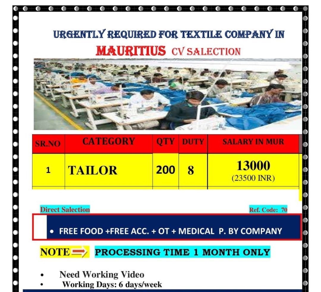 Tailors required for Textile company in Mauritius – CV selection – No advance