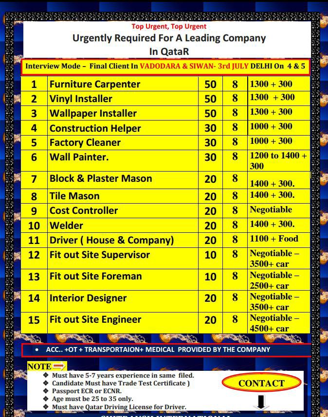 Urgent Requirement for Qatar – 3-4-5 July interview- Vadodara – Baroda – Gujarat and Siwan – Bihar – Fit out site supervisor – Foreman – Engineer – Interior designer – Cost controller-Welder-Driver-Mason-Helper-Cleaner- Carpenter