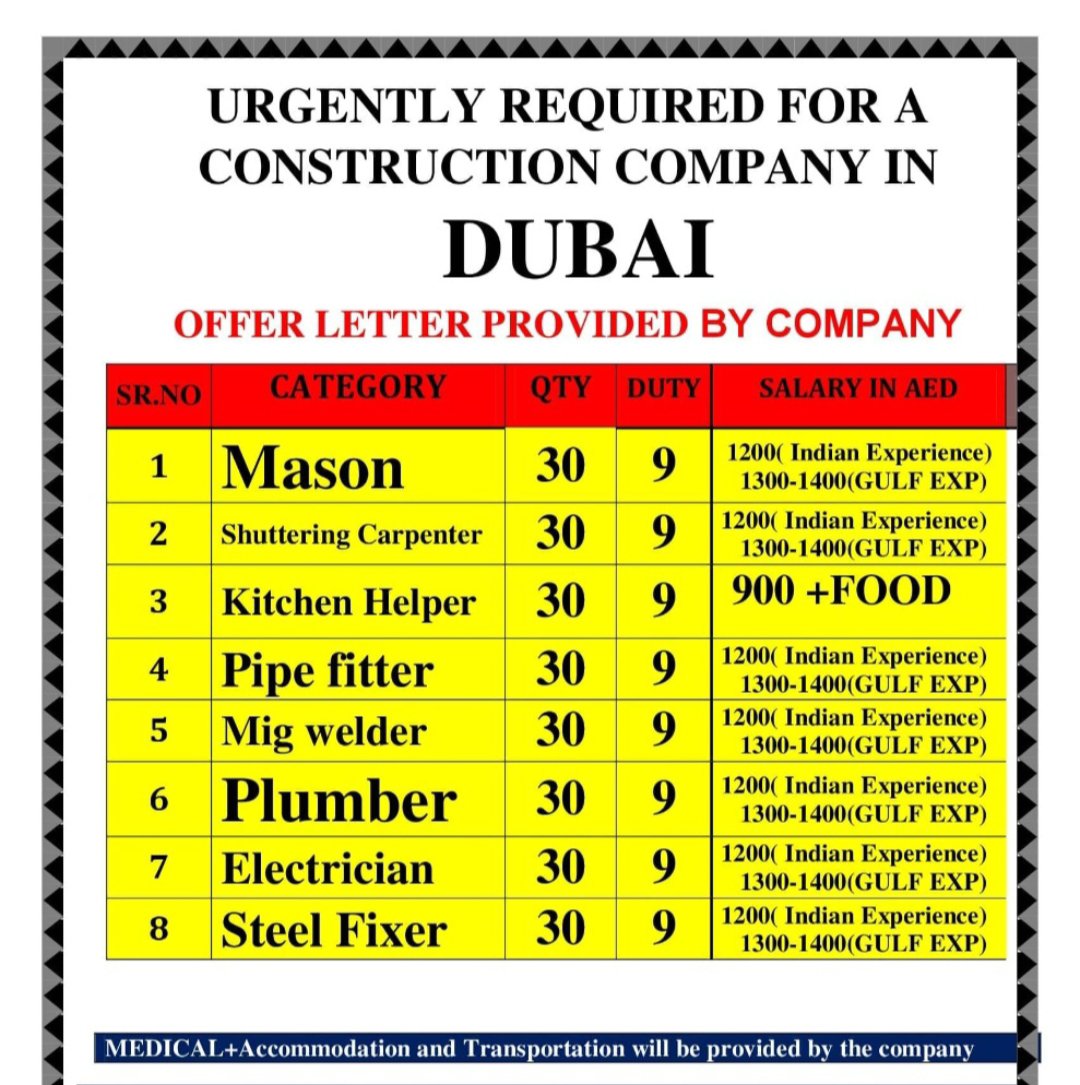 Urgently Required for Dubai – Mason – Carpenter – Helper – Fitter – Plumber – Welder – Steel Fixer – Electrician