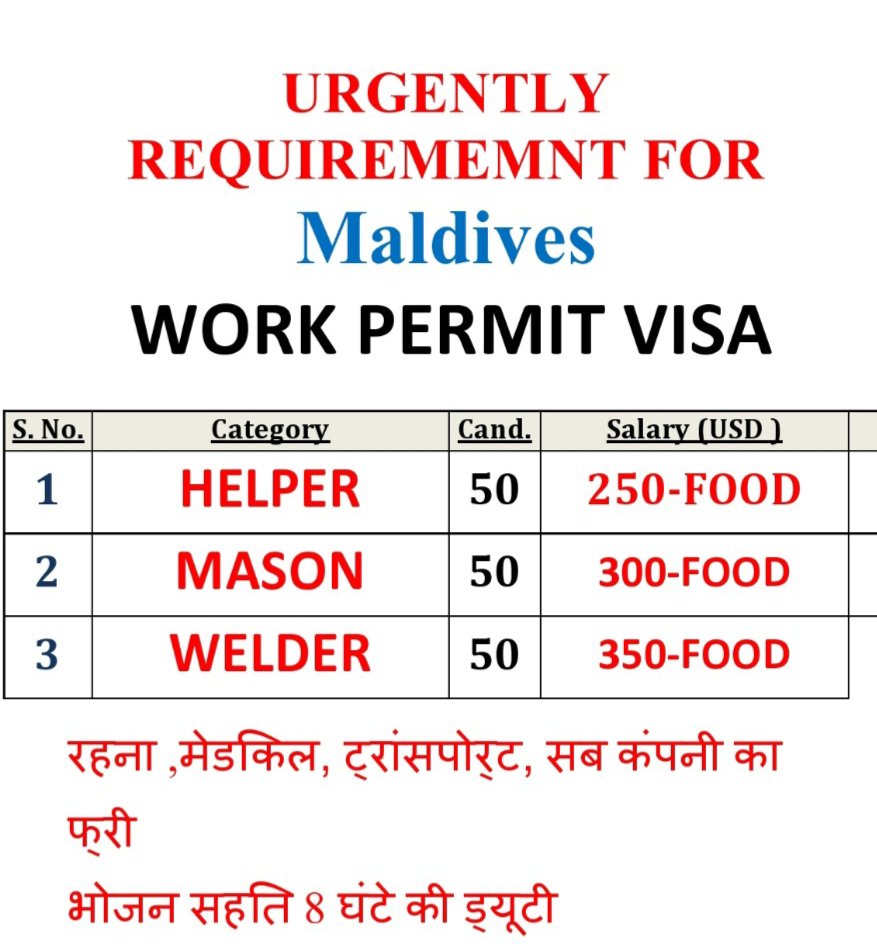 Urgently Required in Maldives – Helper – Mason – Welder – Salary in US Dollar