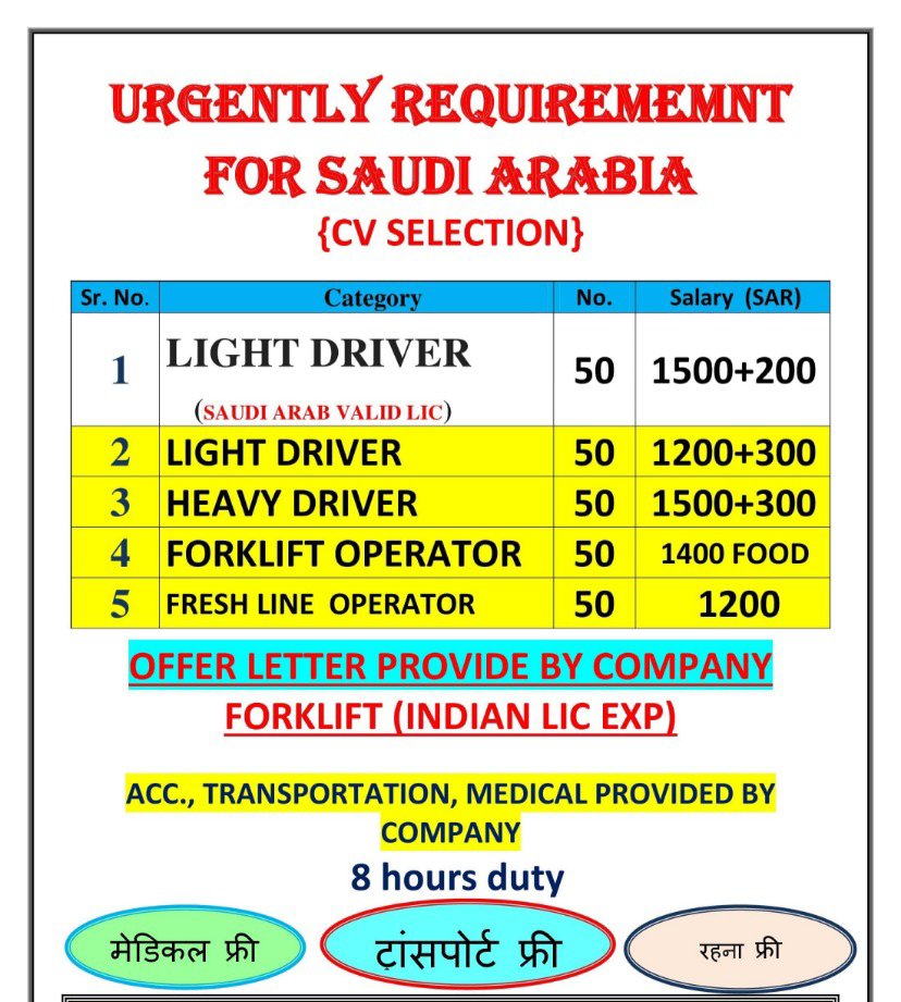 Requirements for Saudi- Light driver- Heavy driver- Forklift operator- Line operator