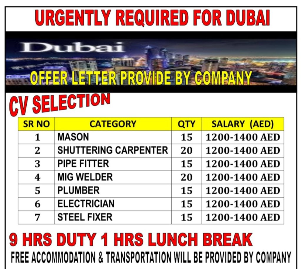 Urgently Required for Dubai- Mason- Shuttering carpenter- Pipe Fitter- Mig welder- Plumber- Electrician- Steel Fixer