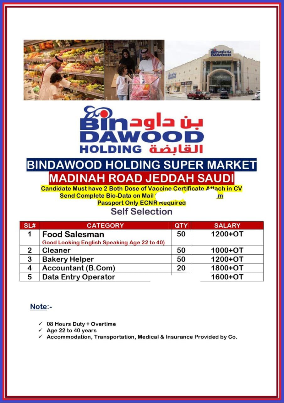 Requirements for Bin Dawood Super Market- Food salesman- Cleaner- Bakery Helper- Accountant- Data entry operator- Jeddah Saudi Arabia