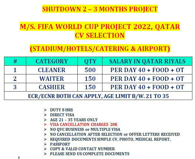 Fifa World Cup 2022 Qatar- Cleaner- Waiter- Cashier- Shutdown project
