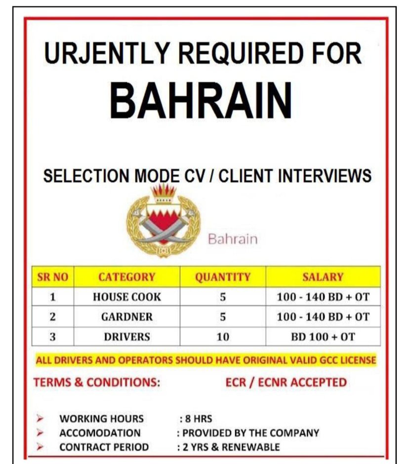Required for House Cook- Gardener- Drivers for Bahrain- GCC License