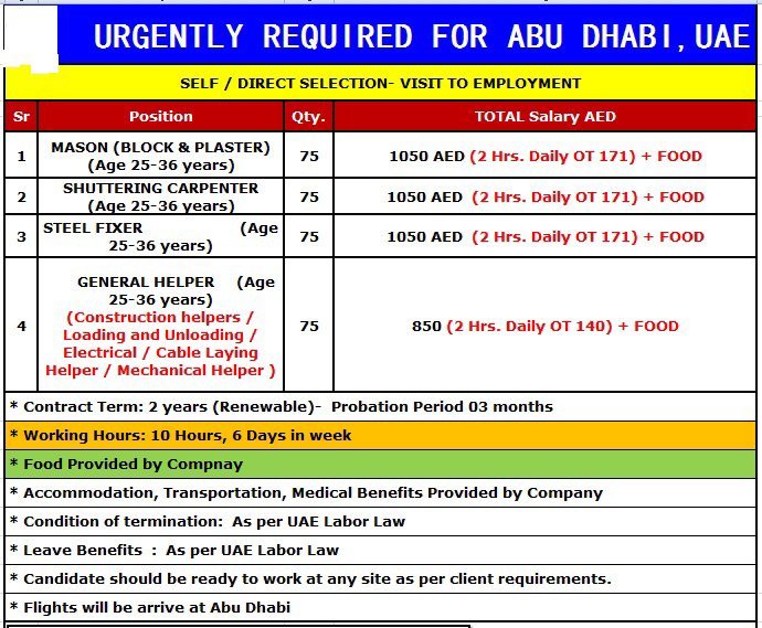 Required Mason- Shuttering Carpenter- Steel Fixer- General Helper for Abu Dhabi UAE