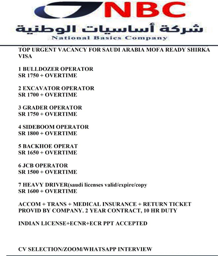 Requirements for National Basics Company NBC- Saudi Arabia- Bulldozer- Excavator- Grader- Sideboom- Backhoe- JCB operators- Heavy Driver