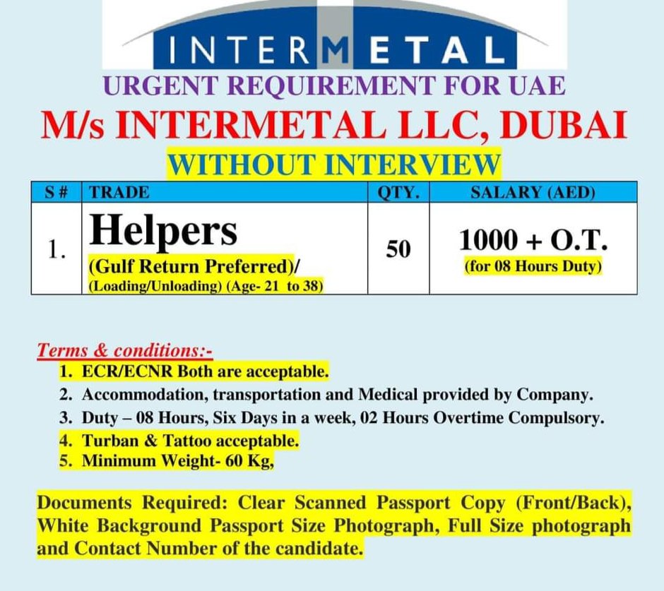 Requirements for Dubai UAE- Helpers- Loading- Unloading- Inter Metal LLC Dubai