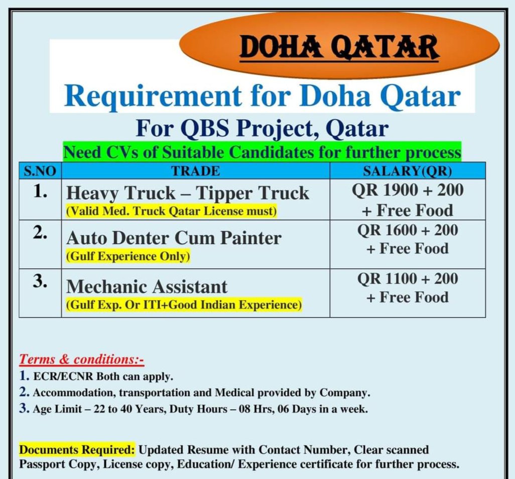 Requirements for Doha Qatar- For QBS Project- Heavy Truck Driver- Auto denter cum Painter- Mechanic Assistant
