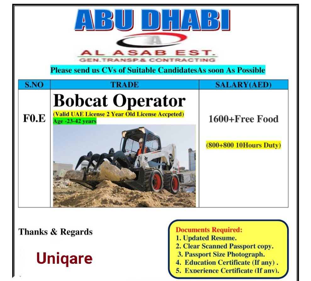 Required Bobcat Operator- Al Asab est- Dubai