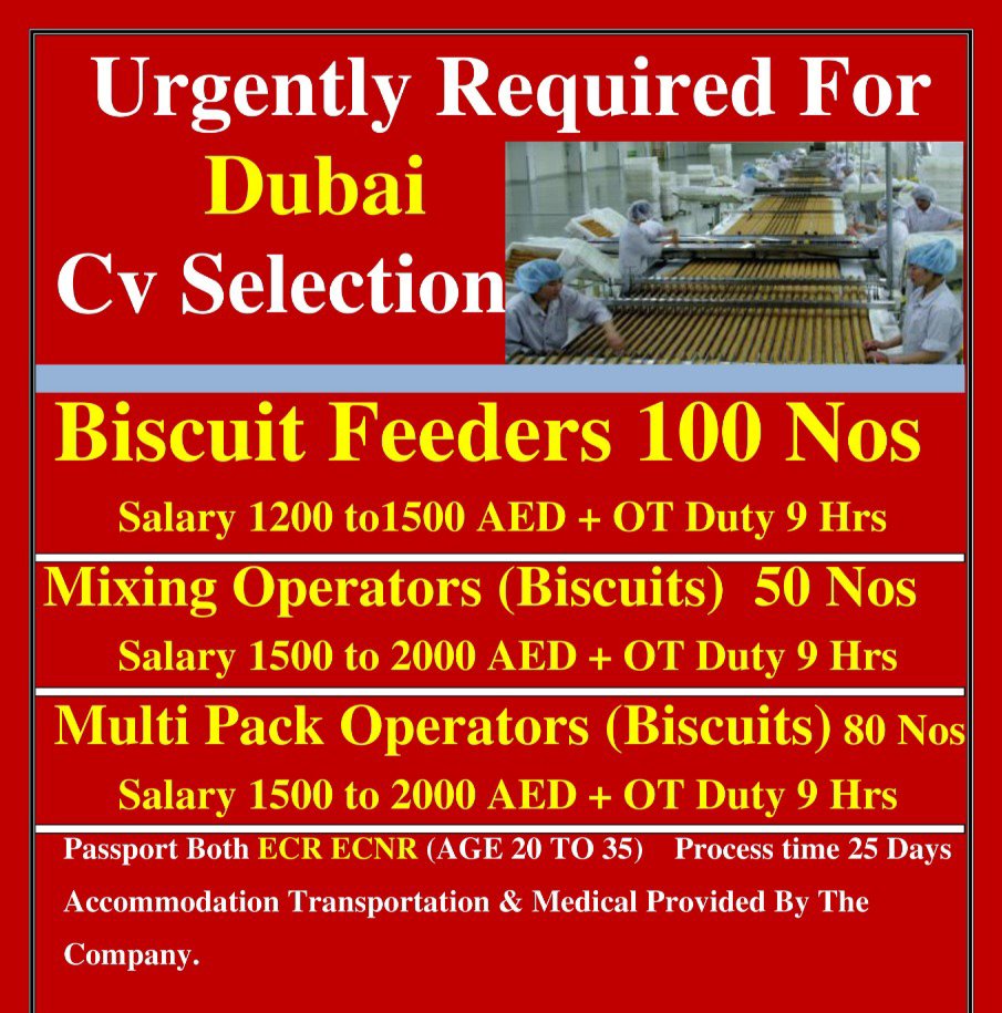 Requirements for Biscuit Factory in Dubai- Feeders- Packing Operators- Mixing Operators- ECR- ECNR passport