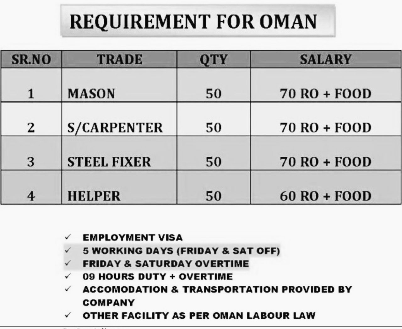 Requirements for Oman- Mason- Steel Carpenter- Steel Fixer- Helper