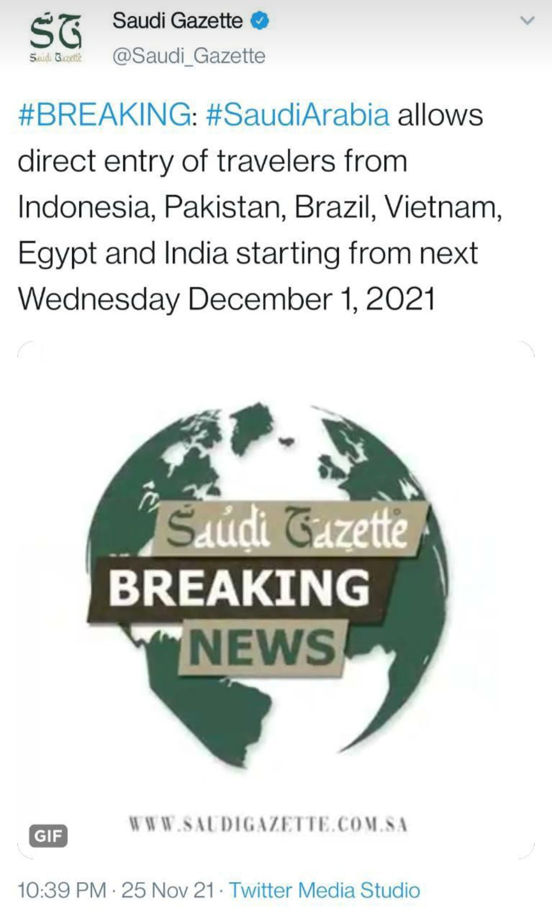 Saudi Arabia will allow direct entry to travellers from Indonesia, Pakistan, Brazil, Vietnam, Egypt and India from Dec.
