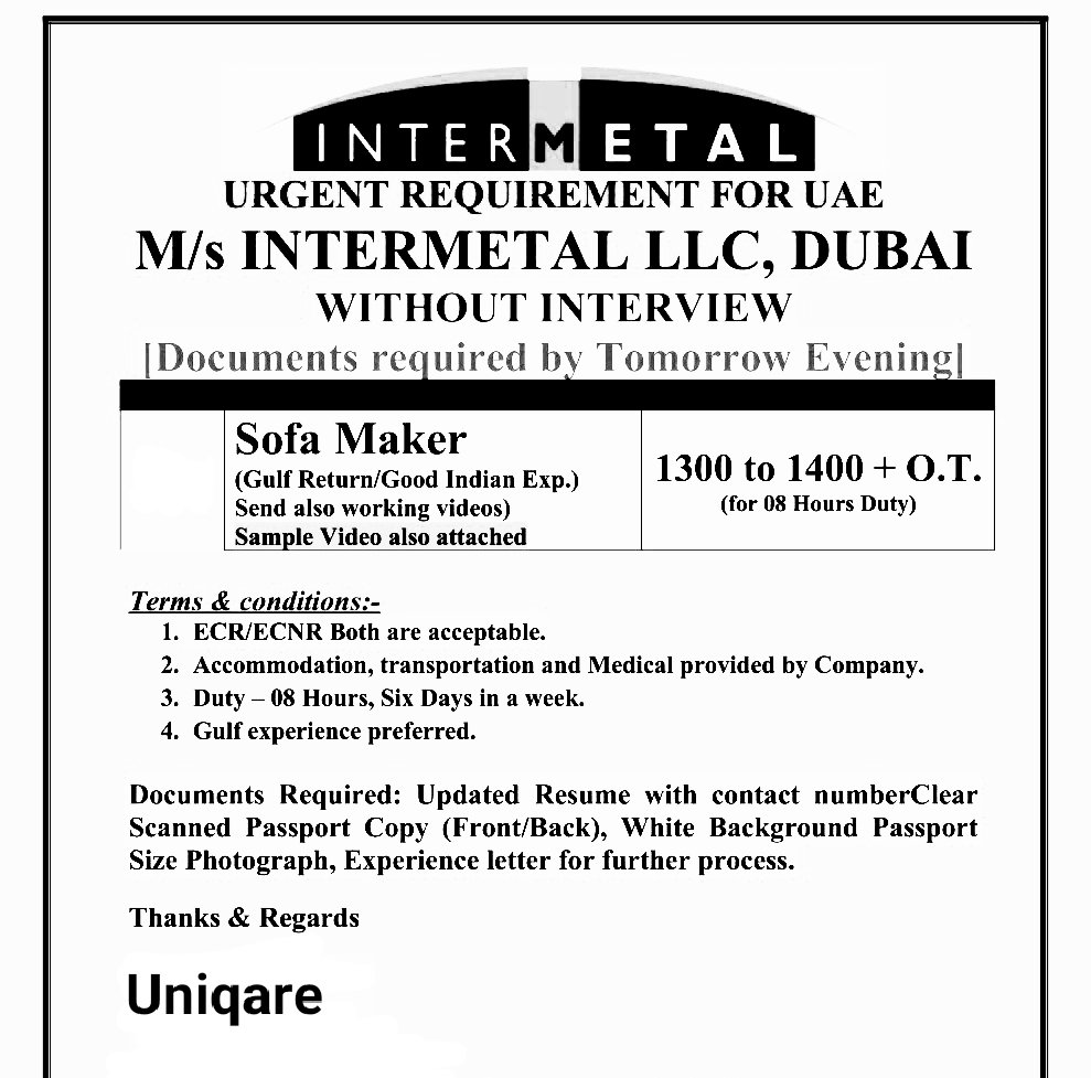 Intermetal LLC Dubai- Required Sofa Maker- Video Selection- Urgent