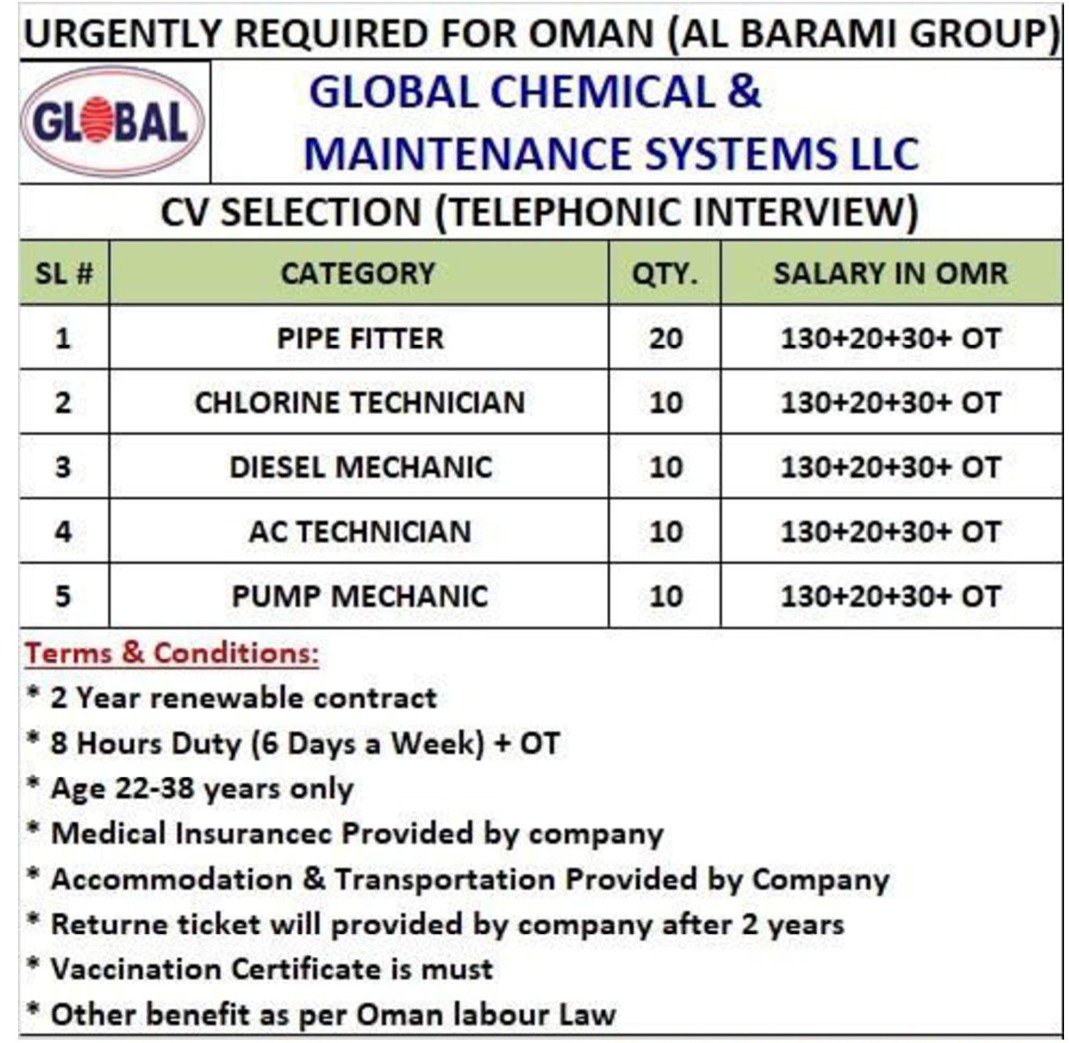 Al Barami Group- Global Chemical Maintainace System LLC requirements- Pipe fitter- Technician- Mechanics- Oman
