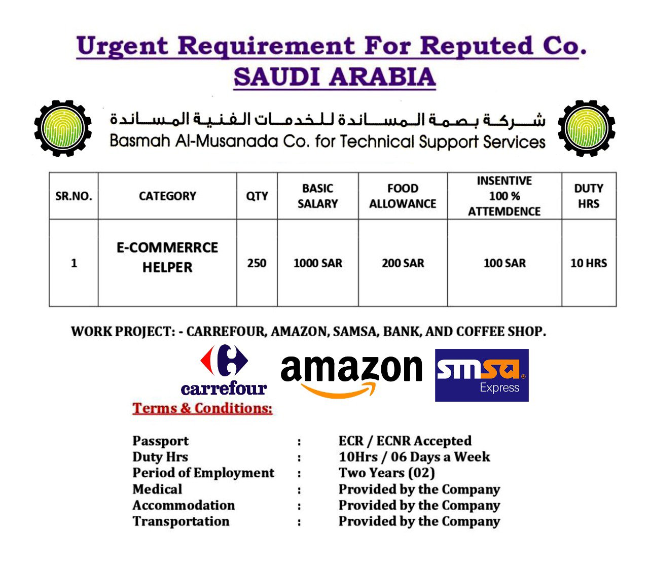 Urgently Required- Saudi Arabia KSA- E Commerce Helper- Basmah Al Musnadah- Employment Visa