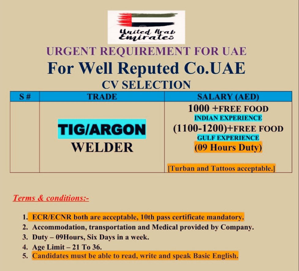 Required TIG ARGON WELDER for UAE- CV selection- Free Food- ECR ECNR Passport accepted