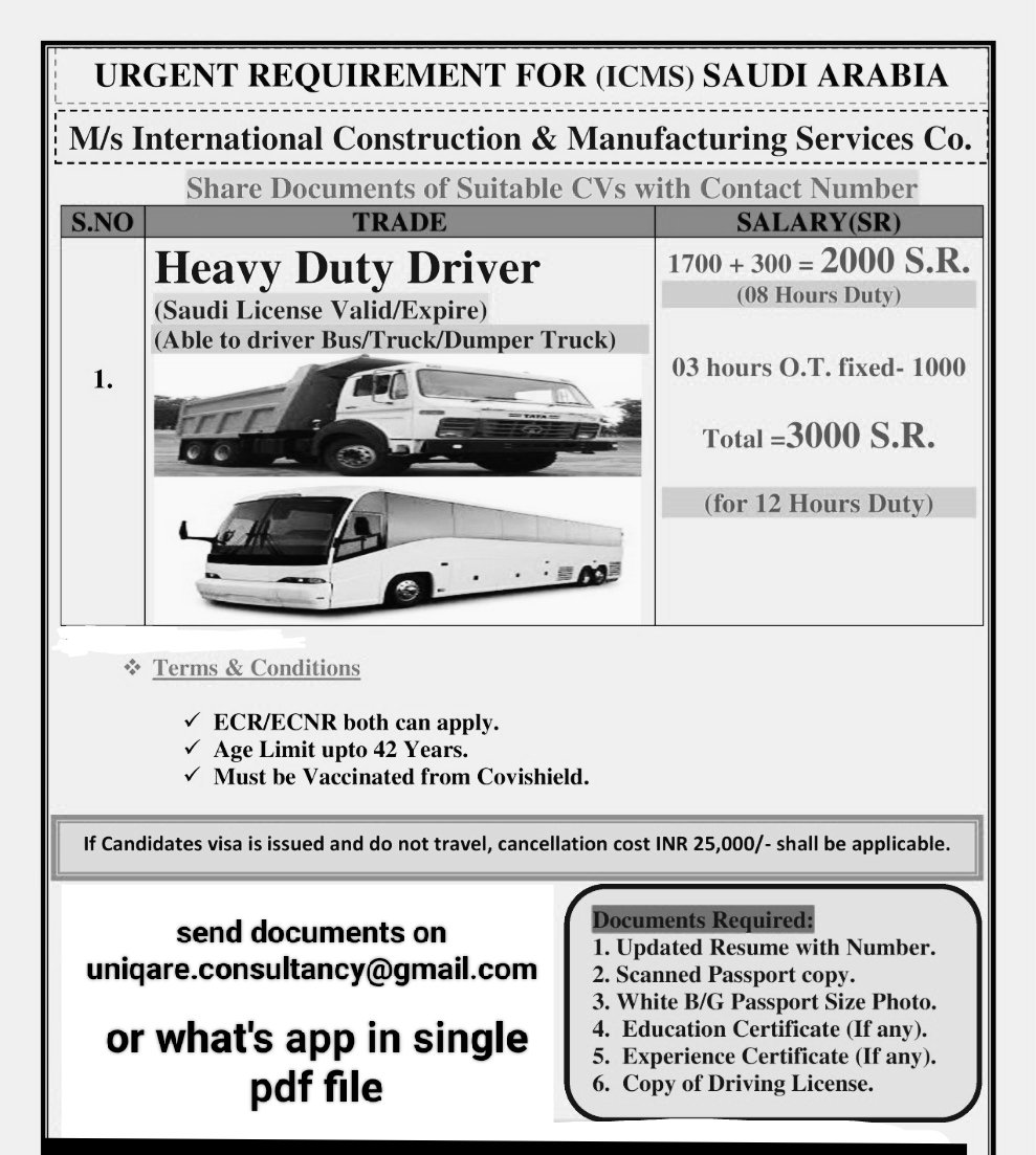Urgent Requirement for Heavy Driver for Saudi Arabia
