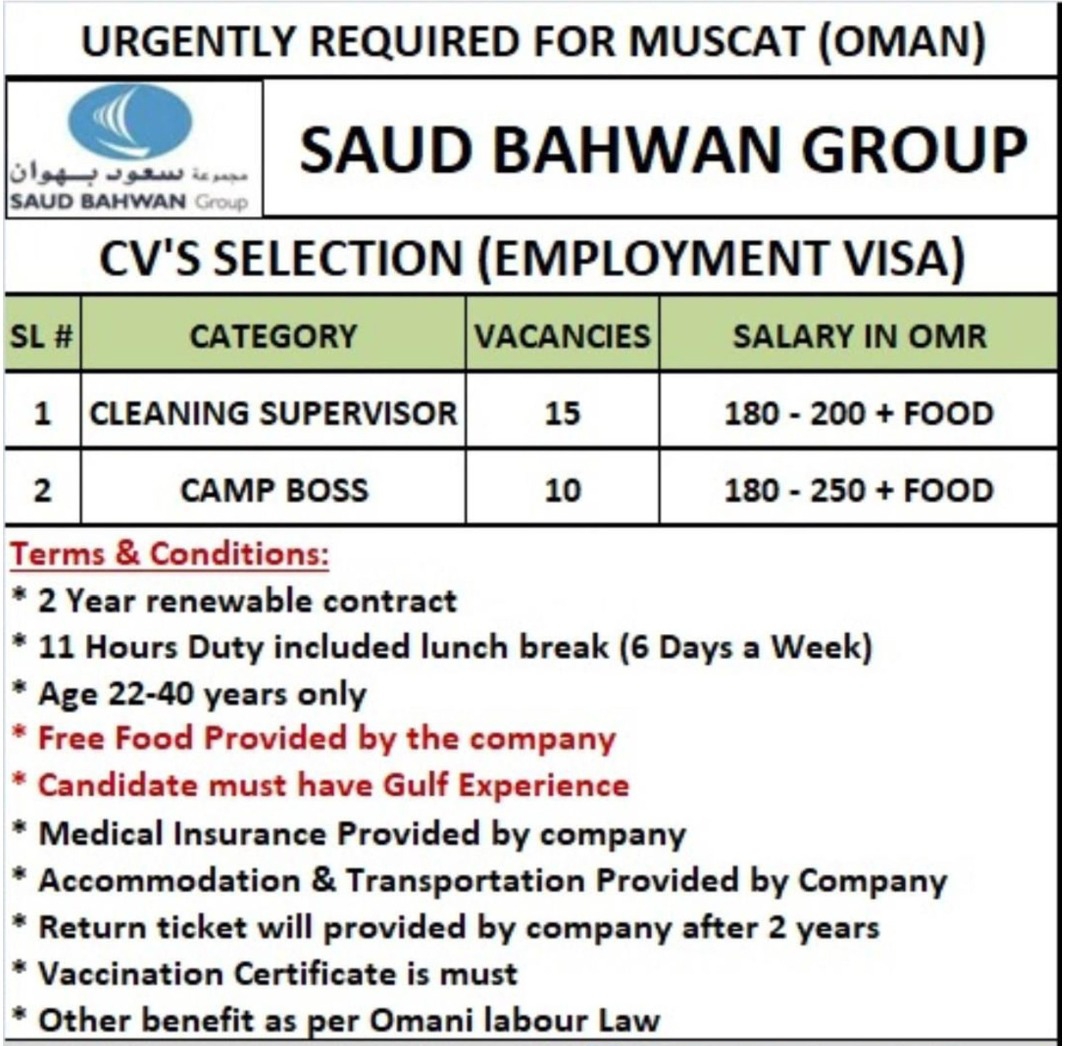 Urgently Required for Oman- Saud Bahwan Group- Cleaning supervisor- Camp boss