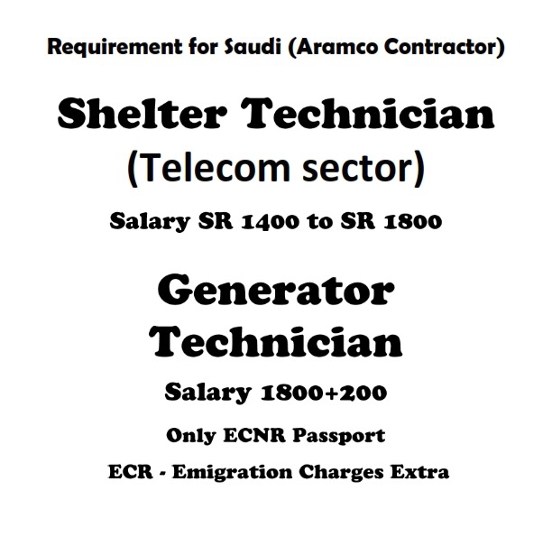 Jobs in Saudi Arabia – Shelter Technician – Telecom Sector – Generator Technician – Saudi ARAMCO contractor