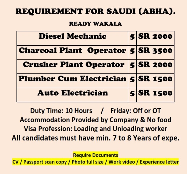 Duty Time: 10 Hours / Friday: Off or OT Accommodation Provided by Company & No food Visa Profession: Loading and Unloading worker All candidates must have min. 7 to 8 Years of expe.