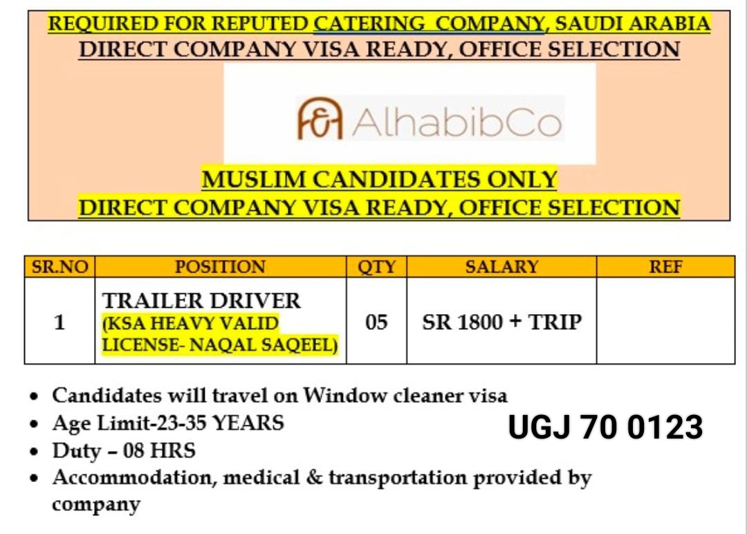 Heavy Driver – Trailer Driver Jobs in Saudi Arabia – Nakal Shakeel Valid license – Office selection – Al Habib company Saudi Arabia