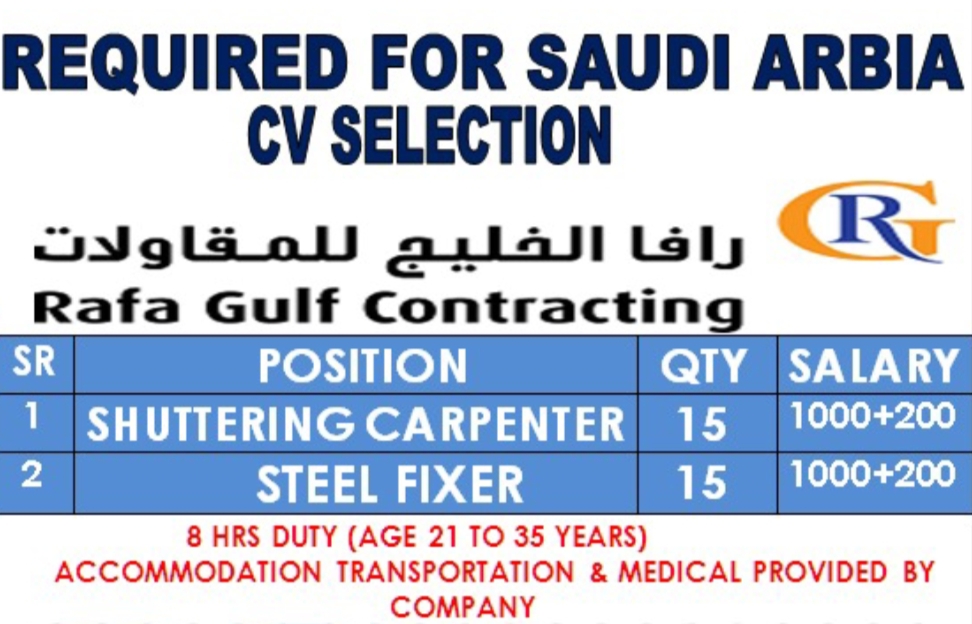 8 HRS DUTY (AGE 21 TO 35 YEARS) ACCOMMODATION TRANSPORTATION & MEDICAL PROVIDED BY COMPANY