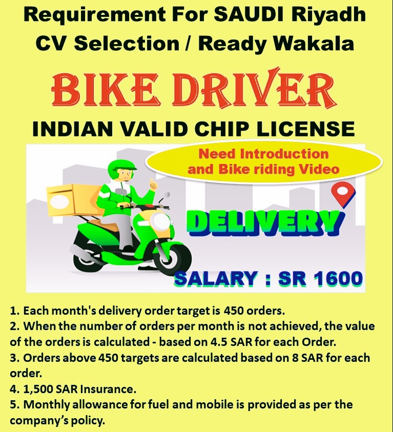 Bike Delivery Driver for Saudi Arabia Riyadh – Indian license – Video Selection – Good salary and commission – Apply Now