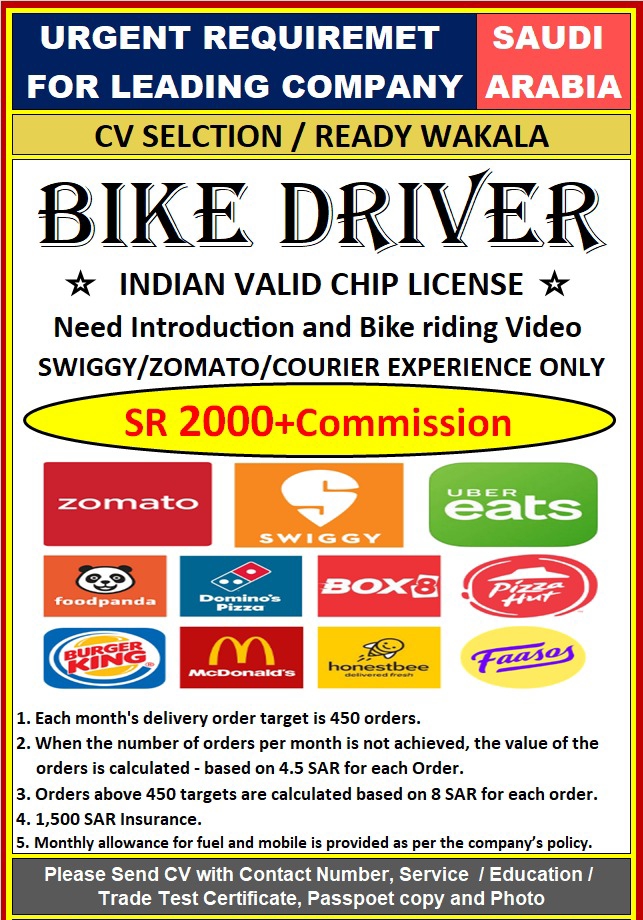 Bike delivery driver job in Saudi Arabia – Indian license accepted – CV Video Selection – Bike driving jobs in Gulf countries