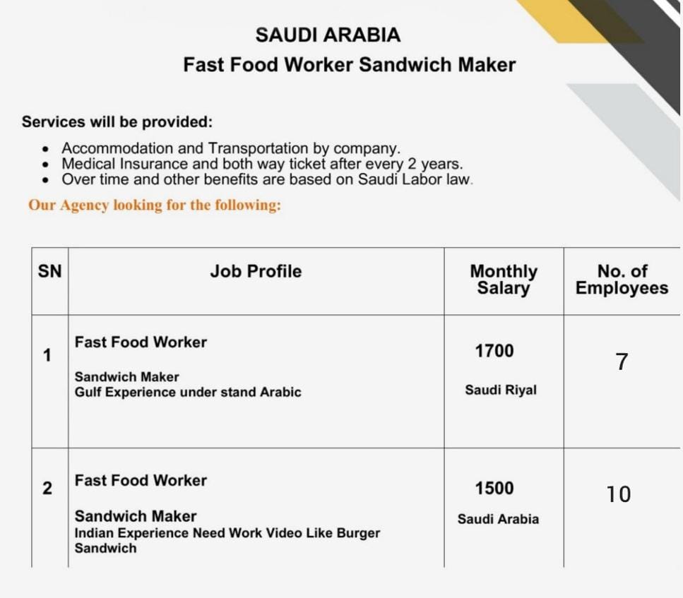 Fast Food Workers – Sandwich Maker – Burger Maker – Required for Saudi Arabia – Gulf and Indian experienced
