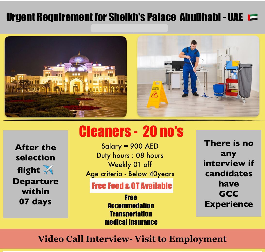 शेख पैलेस अबू धाबी – संयुक्त अरब अमीरात के लिए तत्काल आवश्यकता सफाईकर्मी की