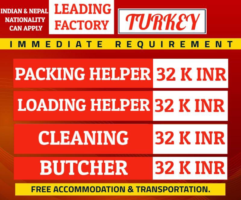 Jobs in Turkey – Leading Factory required for Packing Helper – Loading Helper – Cleaning Labour – Butcher