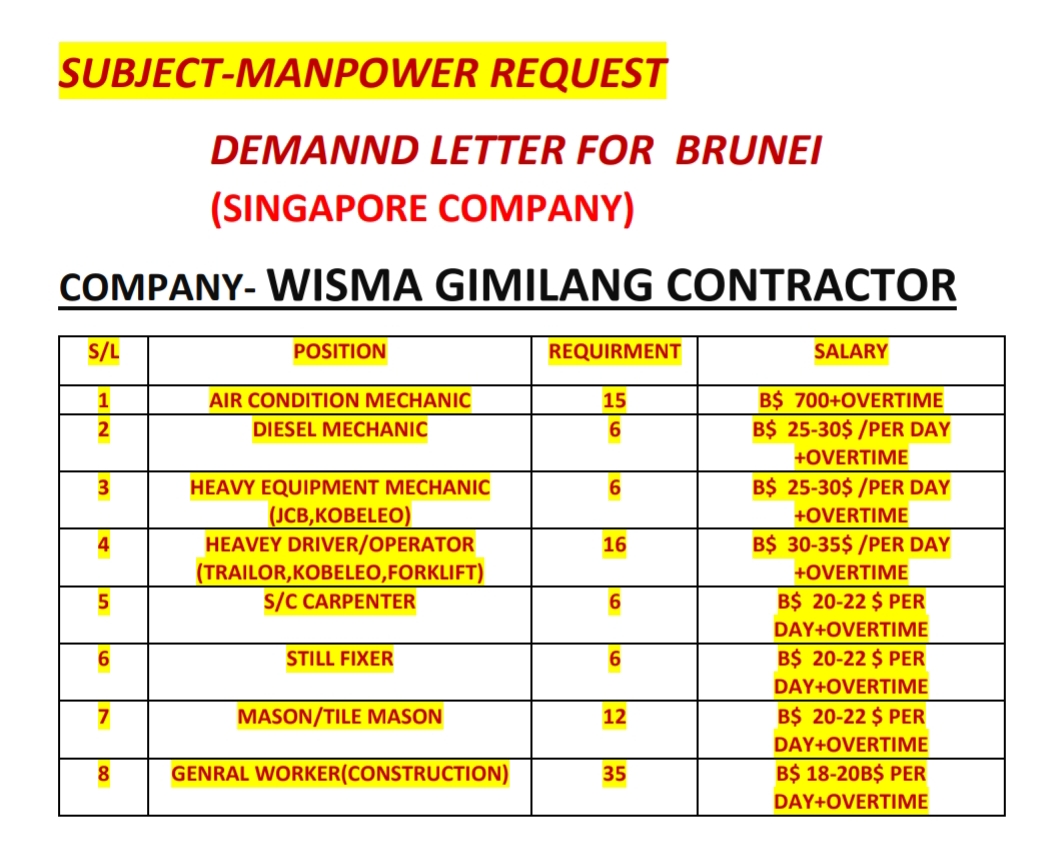 DUTY -8 HOURS +OVERTIME PAID AS PER BRUNEI LABOUR LAW ACCOMODATION,TRANSPORTATION PROVIDED BY COMPANY