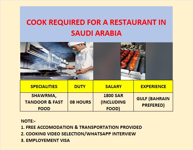 COOK REQUIRED FOR A RESTAURANT IN SAUDI ARABIA