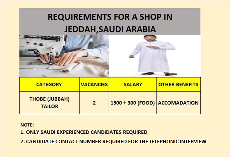 Arabi Jubbah (thobe) tailor required for shop in Saudi Arabia Jeddah