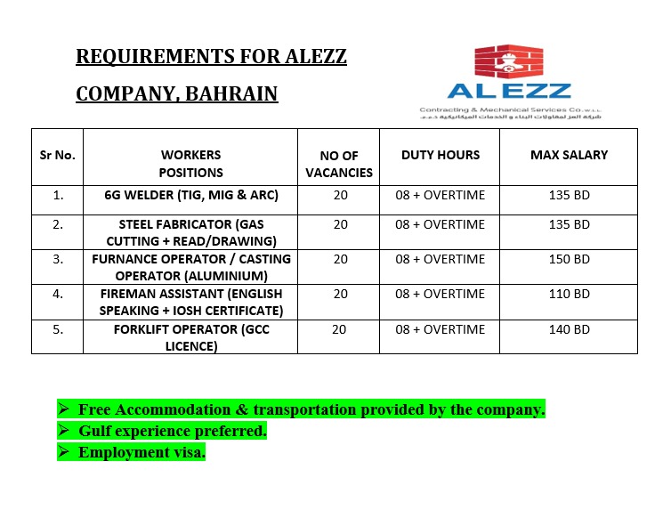 REQUIREMENTS FOR ALEZZ COMPANY, BAHRAIN