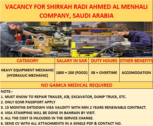 VACANCY FOR SHIRKAH RADI AHMED AL MENHALI COMPANY, SAUDI ARABIA