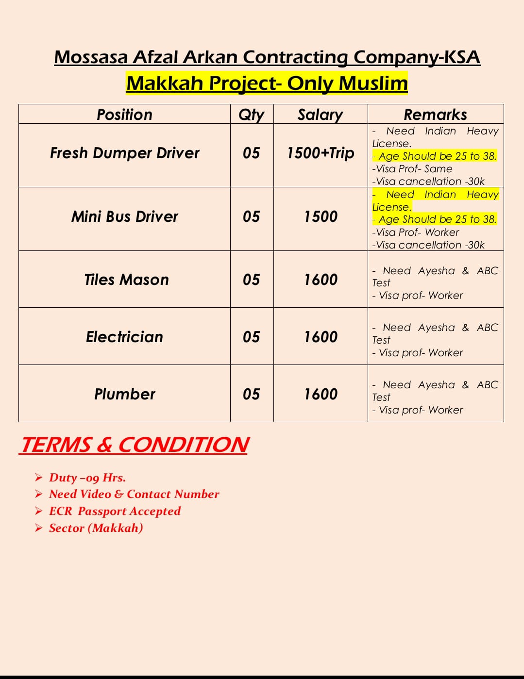 Makkah Project – Mossassa Afzal Arkan Contracting LLC – Saudi Arabia – Urgently Required – Apply Now