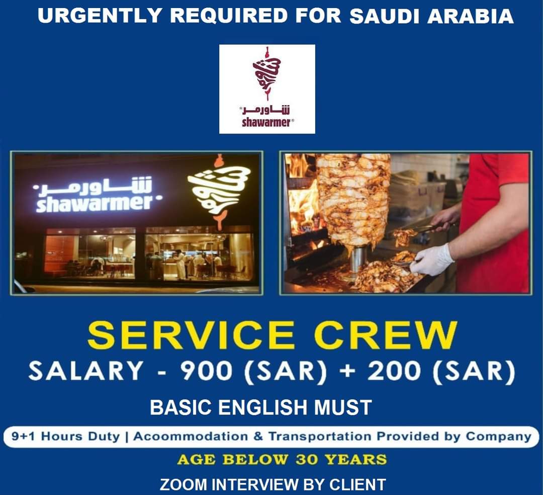 Service Crew for Saudi Arabia – Shawermer Fast food – Online interview – New Gulf vacancy 2024