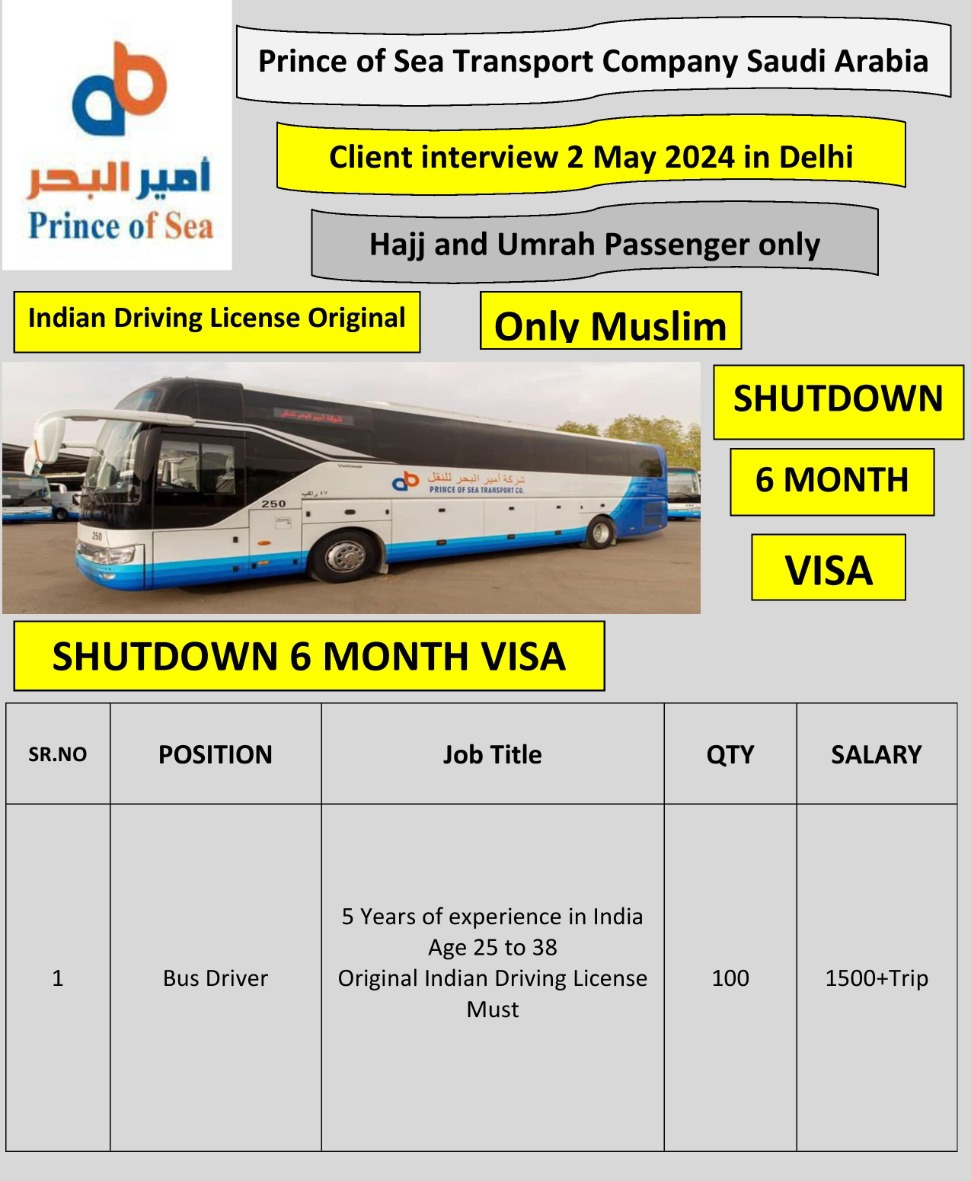 Bus Driver – Indian License – For Hajj and Umrah passengers – Prince of Sea company – Saudi Arabia – 6 months shutdown work – Shutdown Visa Saudi Arabia