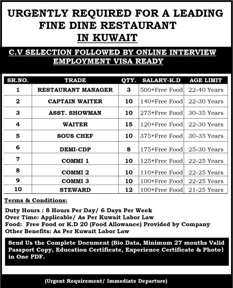 URGENTLY REQUIRED FOR A LEADING FINE DINE RESTAURANT IN KUWAIT