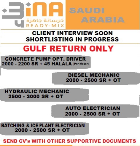 Bina Ready Mix Company Saudi Arabia – Concrete pump operator – Diesel mechanic Hydraulic mechanic – auto electrician – Batching and ice plant electrician – Apply Now