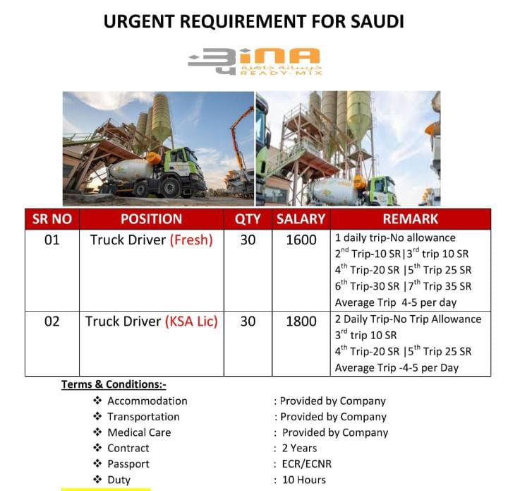 Urgent Requirement for Bina Ready Mix Company Saudi Arabia