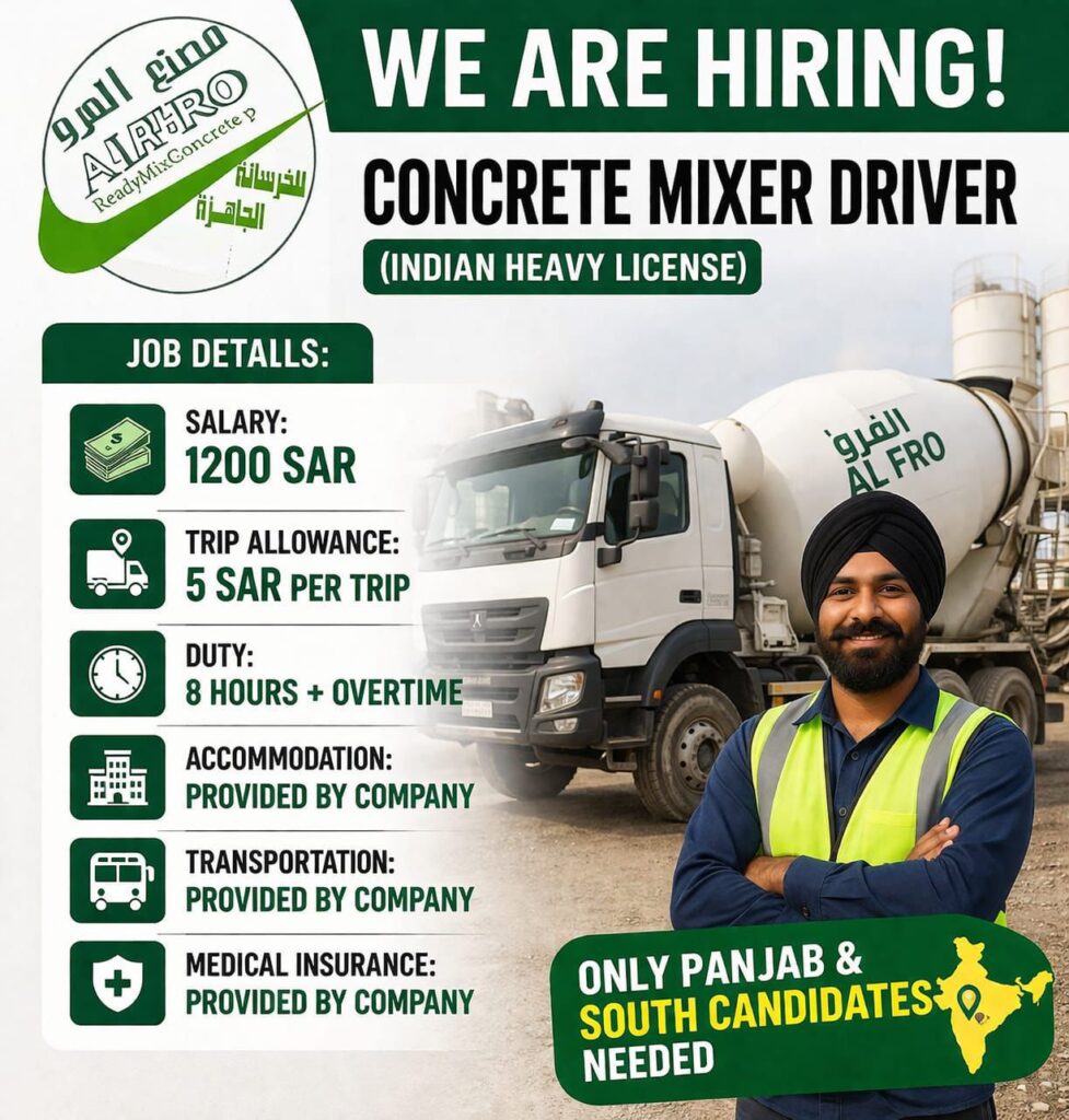 AlFro Readymix Concrete Company Saudi Arabia – Fresh Mixer Truck Driver – Indian licence accepted – Apply Now